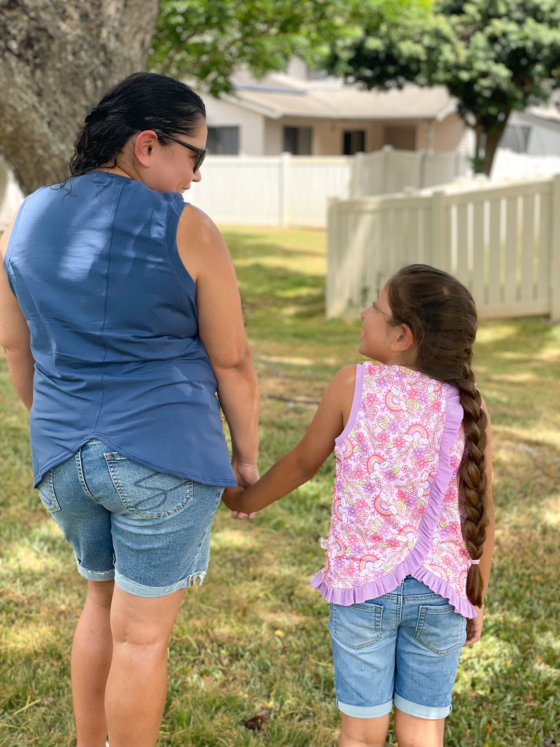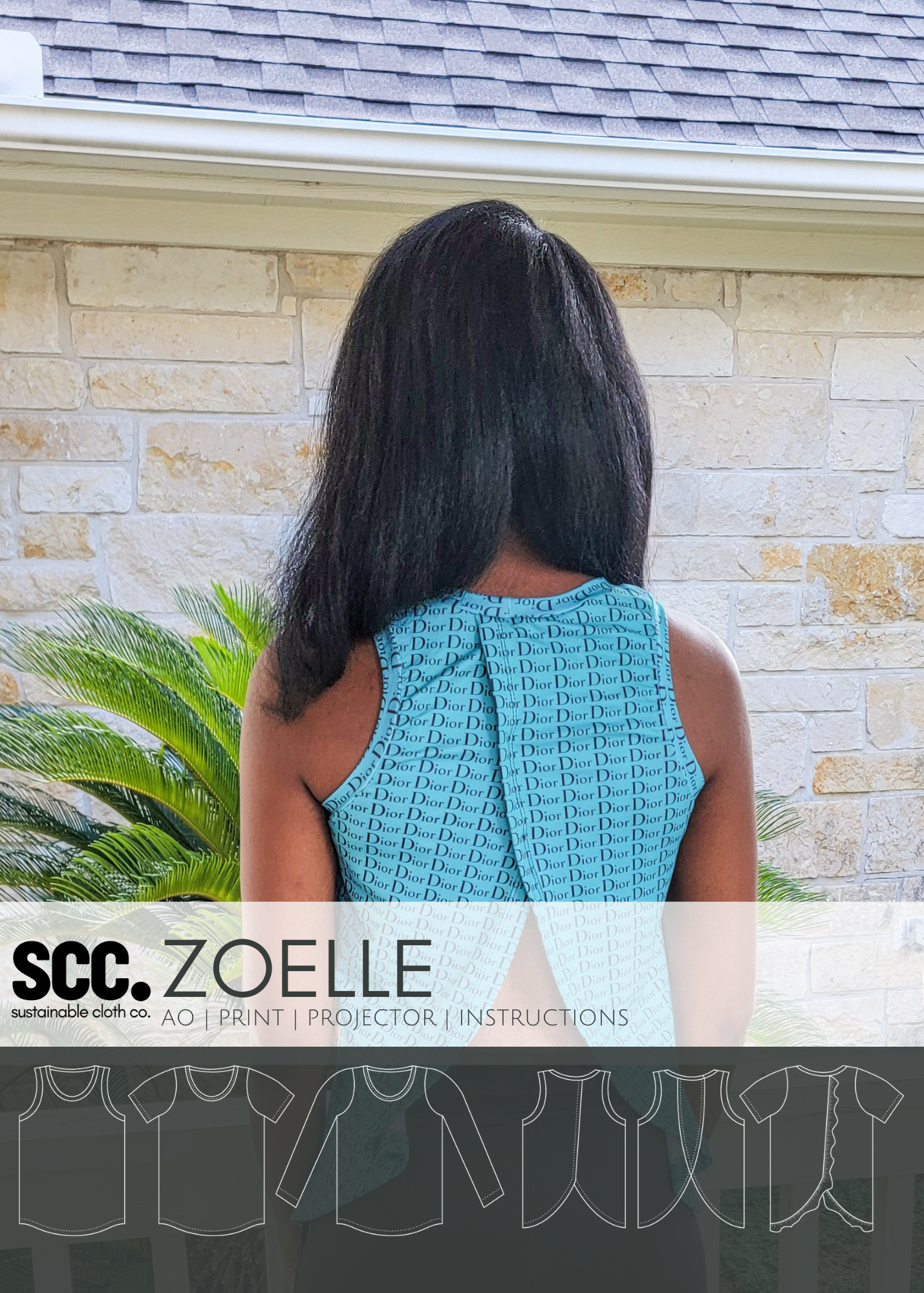 Zoelle is a loose fitting top with four back body finishes- open back, ruffle open back, seam back and ruffle seam back. Zoelle also offers tank, short and long sleeve options to make it all season friendly. Zoelle is a quick sew intended for knit fabrics.