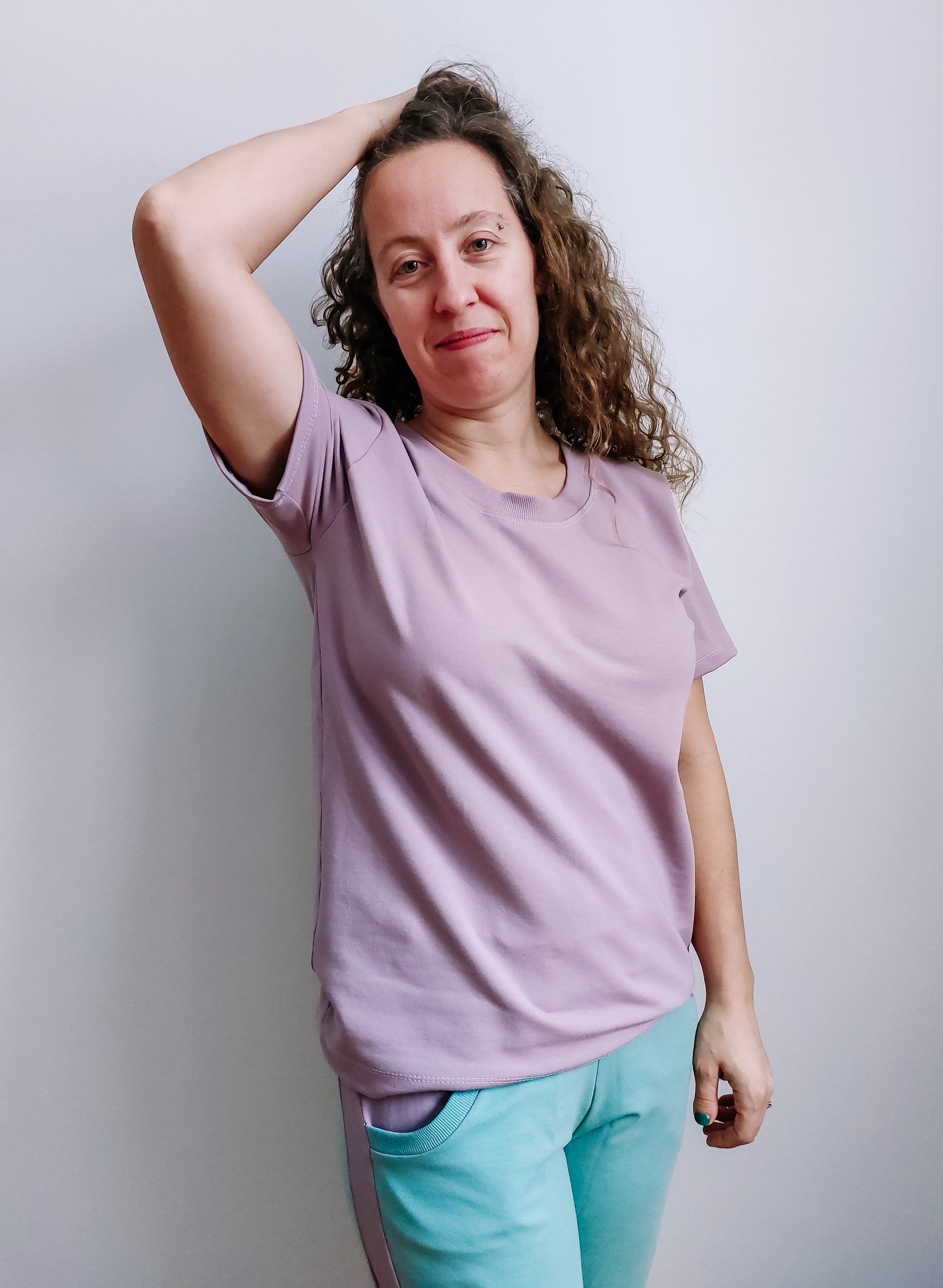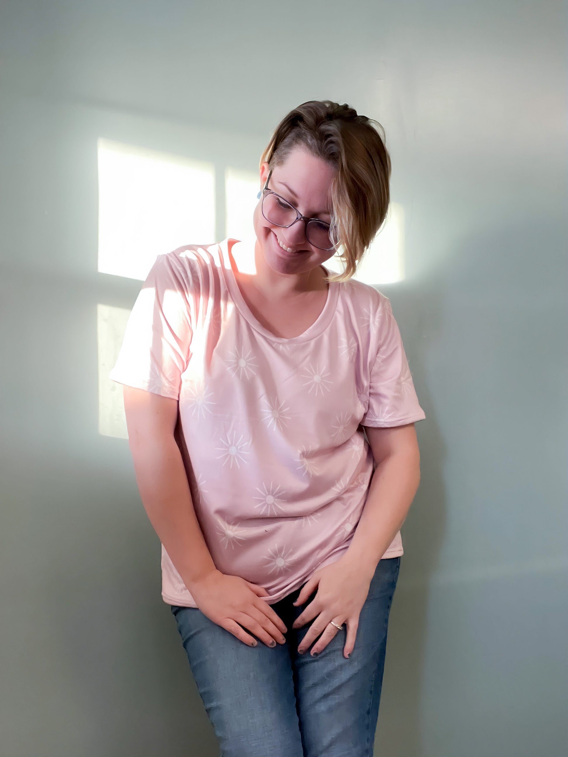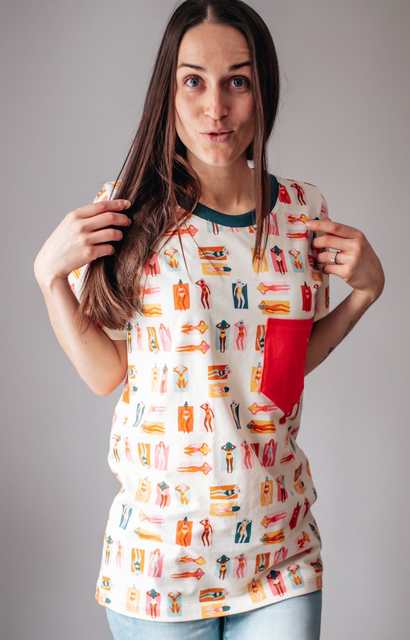 The SCC Basic Tee is a sewing pattern that includes short or long sleeve, an optional chest pocket and two necklines to choose for your preference (basic crew and a lower neckline). The basic tee has been tested from sizes extra small to 5X. This pattern is drafted for knit fabrics with 4 way vertical and horizontal stretch.