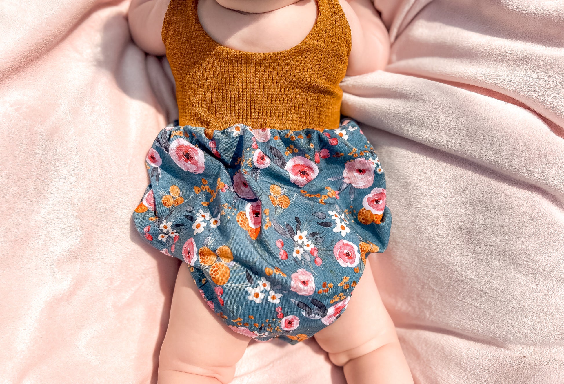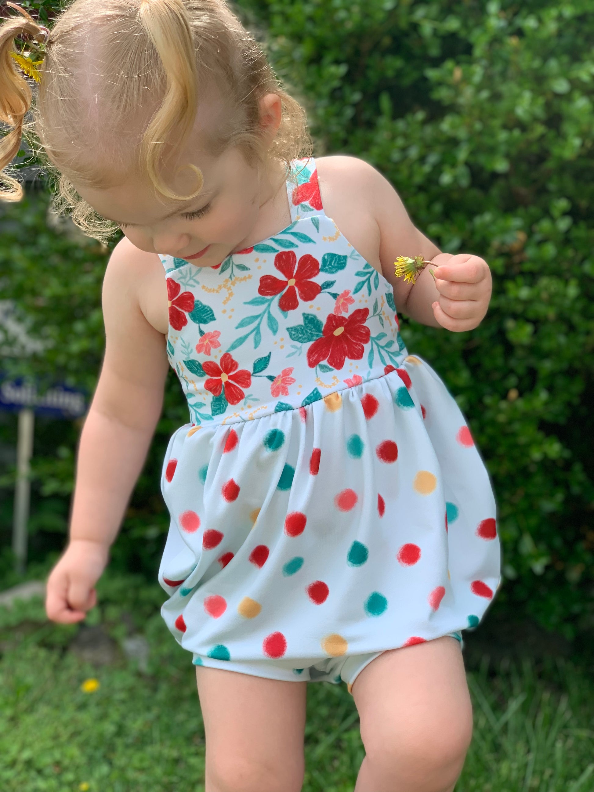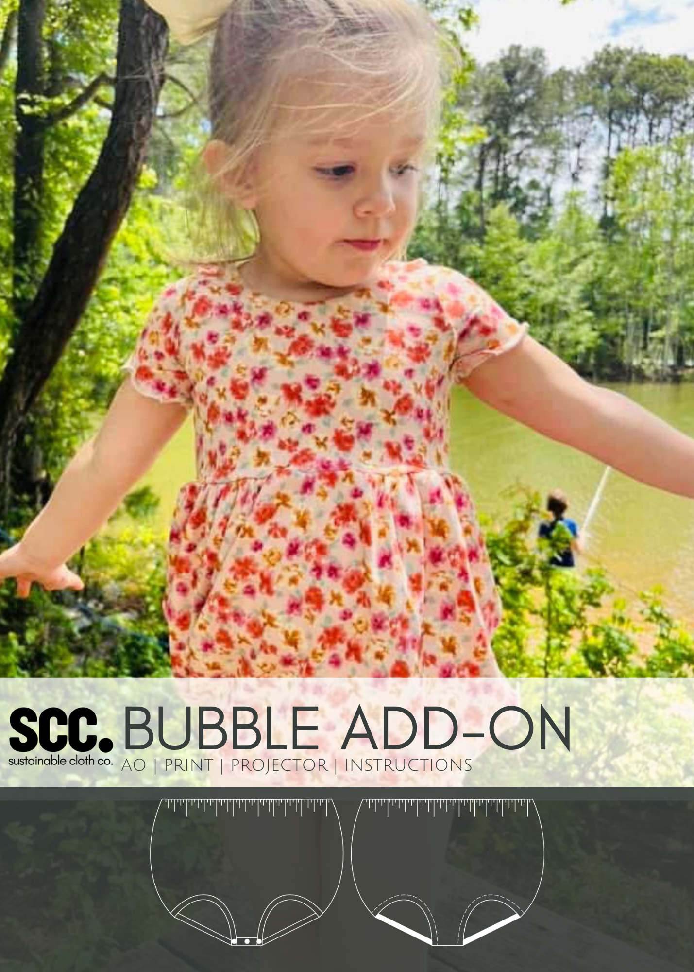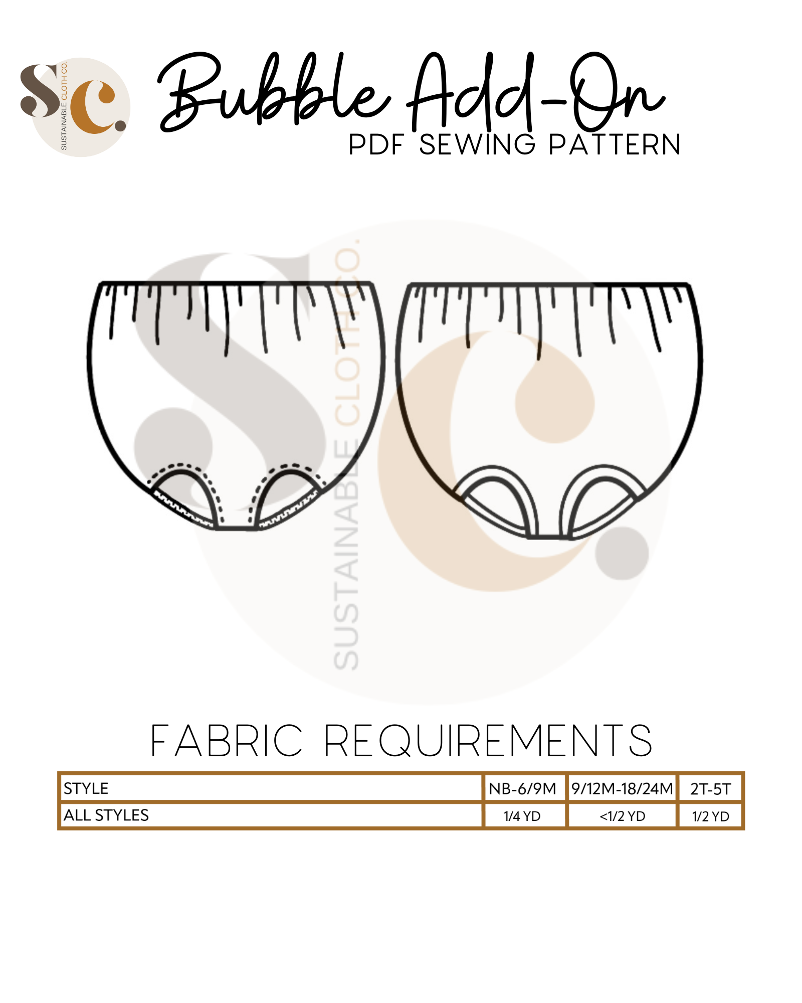 The bubble add-on has been tested with SCC Brielle, Margo and Parker bodices. The bubble add-on comes with two leg finishes, either banded or elastic. These can both be constructed with or without a snap placket for easy access for diaper changes. The bubble add-on is tested through newborn-5T.
