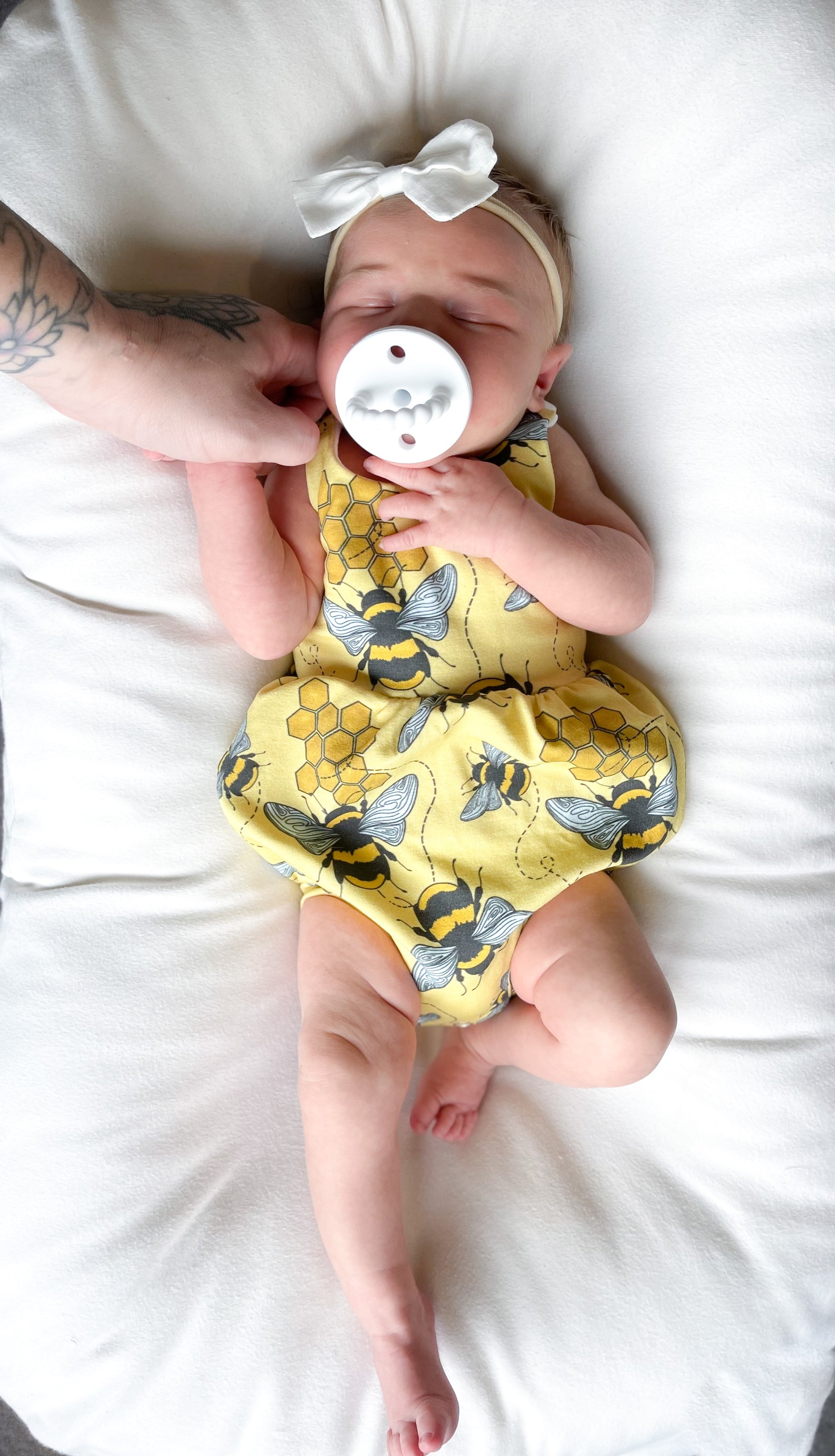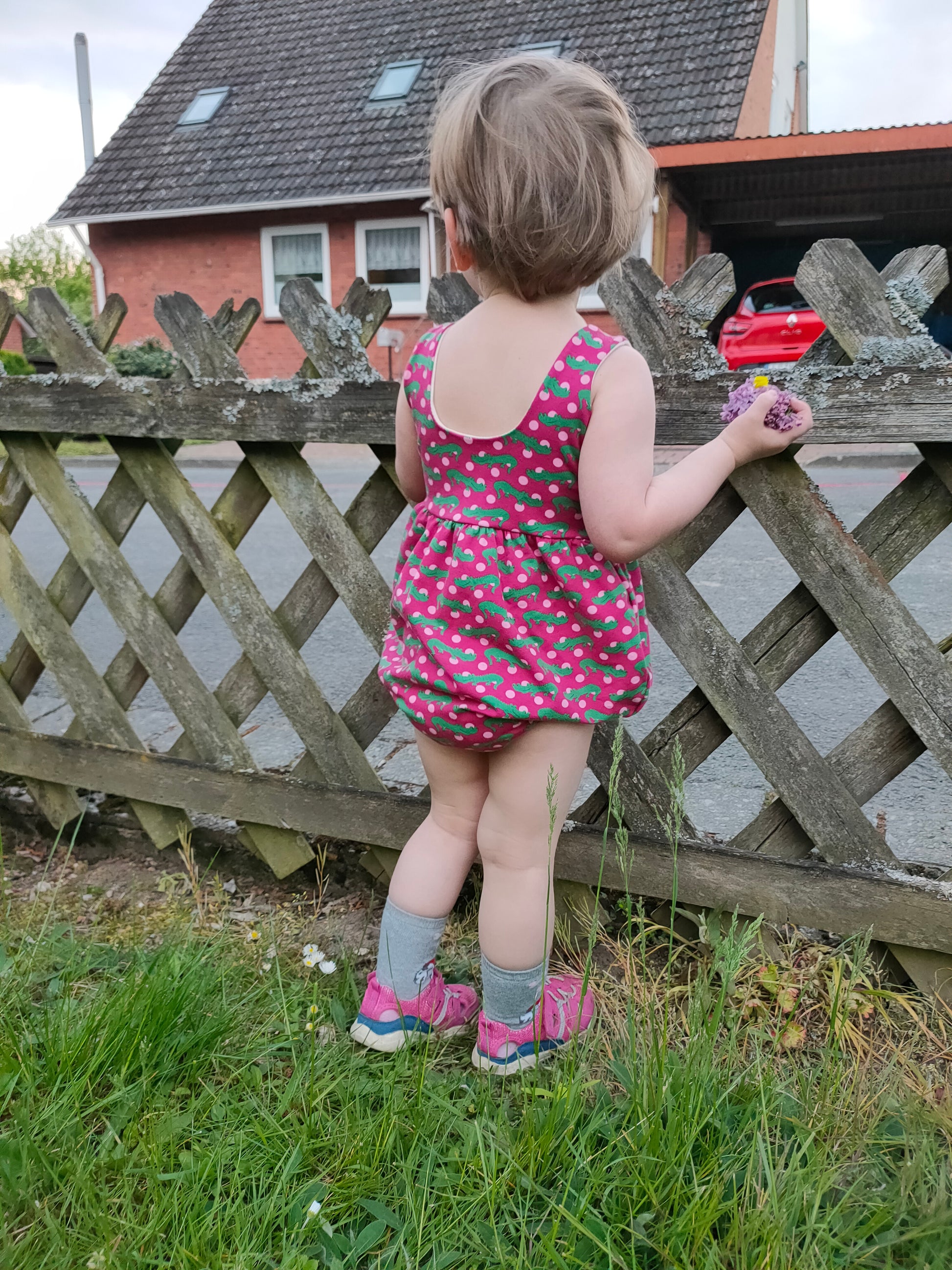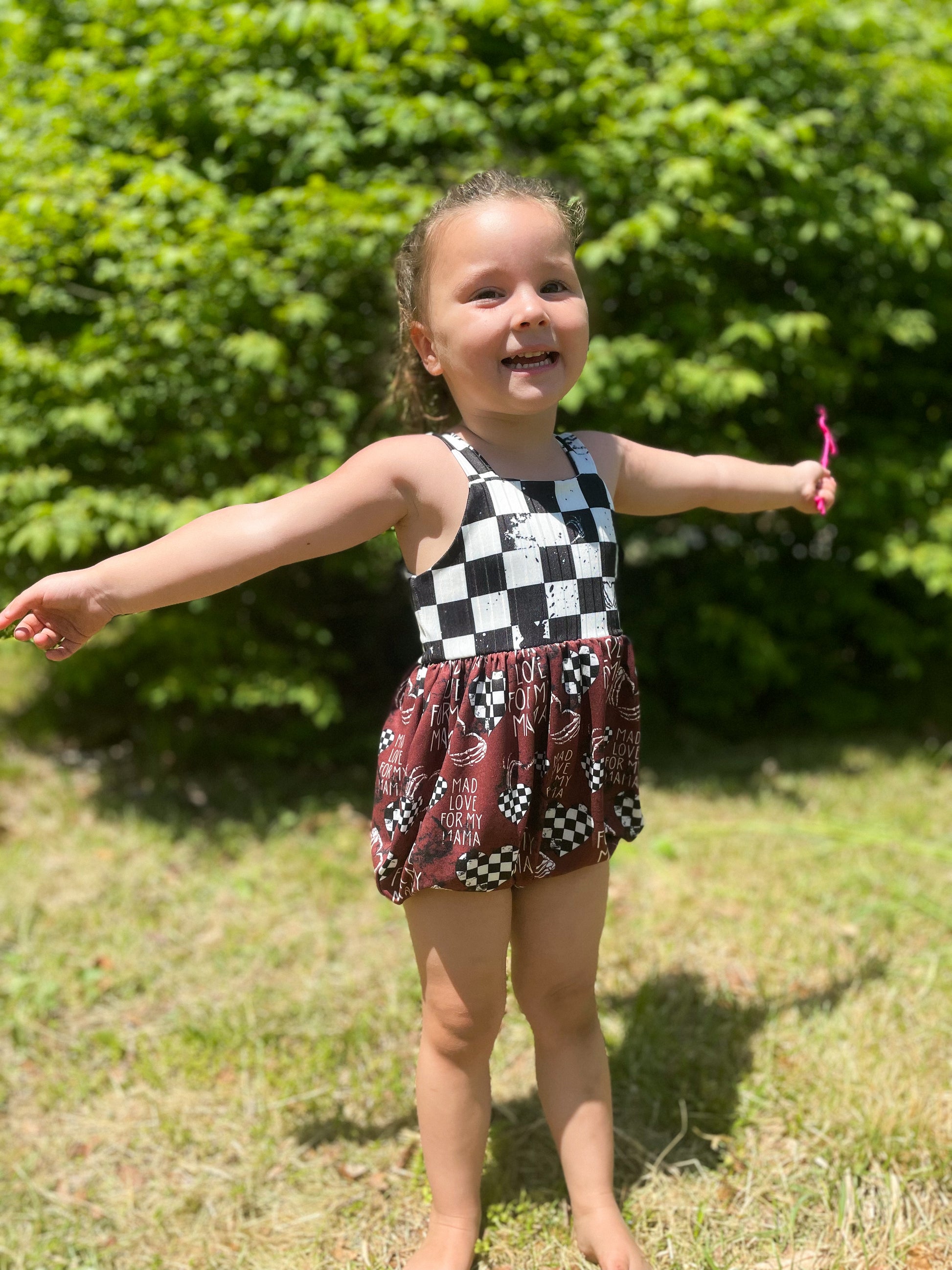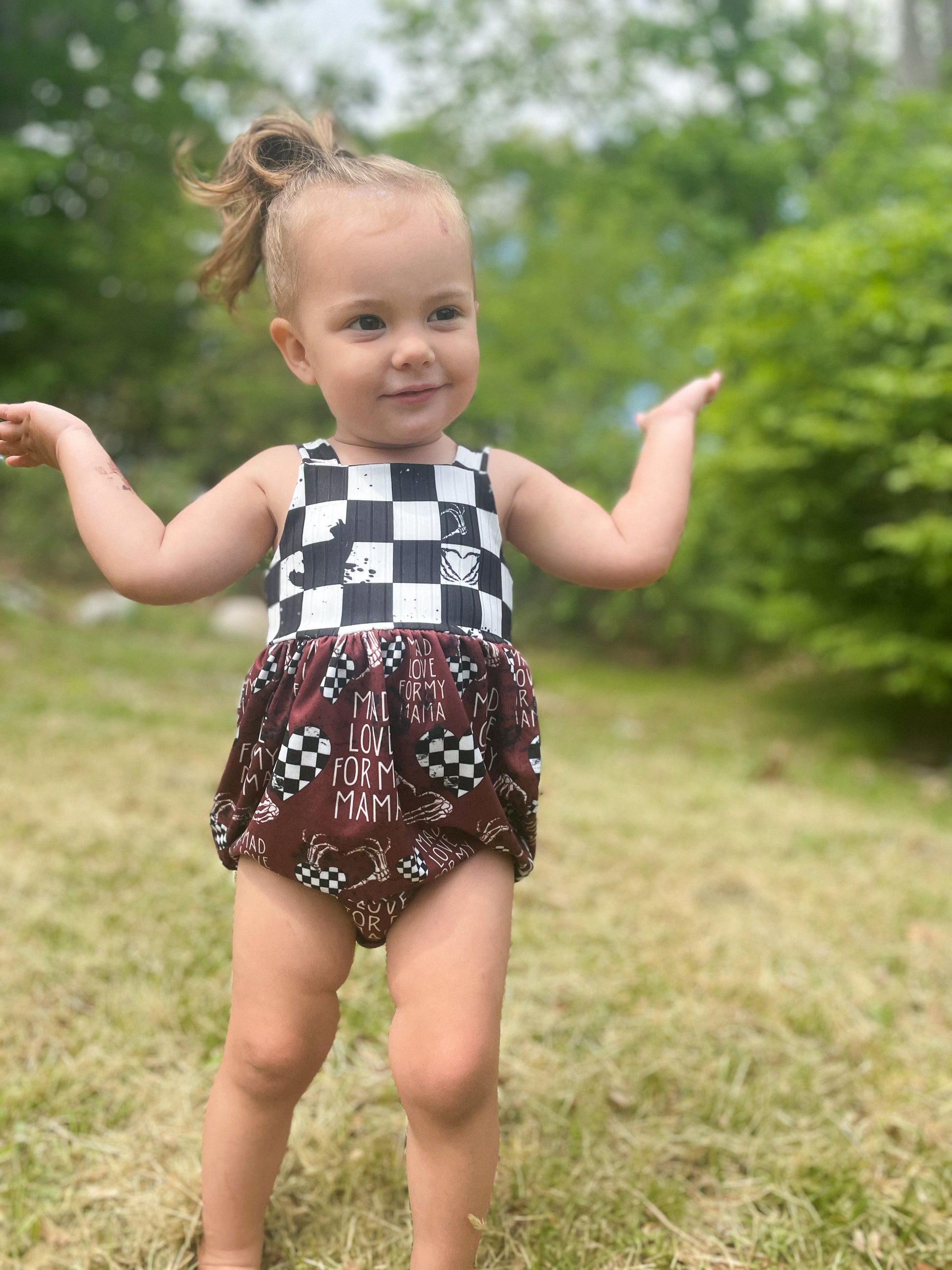 The bubble add-on has been tested with SCC Brielle, Margo and Parker bodices. The bubble add-on comes with two leg finishes, either banded or elastic. These can both be constructed with or without a snap placket for easy access for diaper changes. The bubble add-on is tested through newborn-5T.