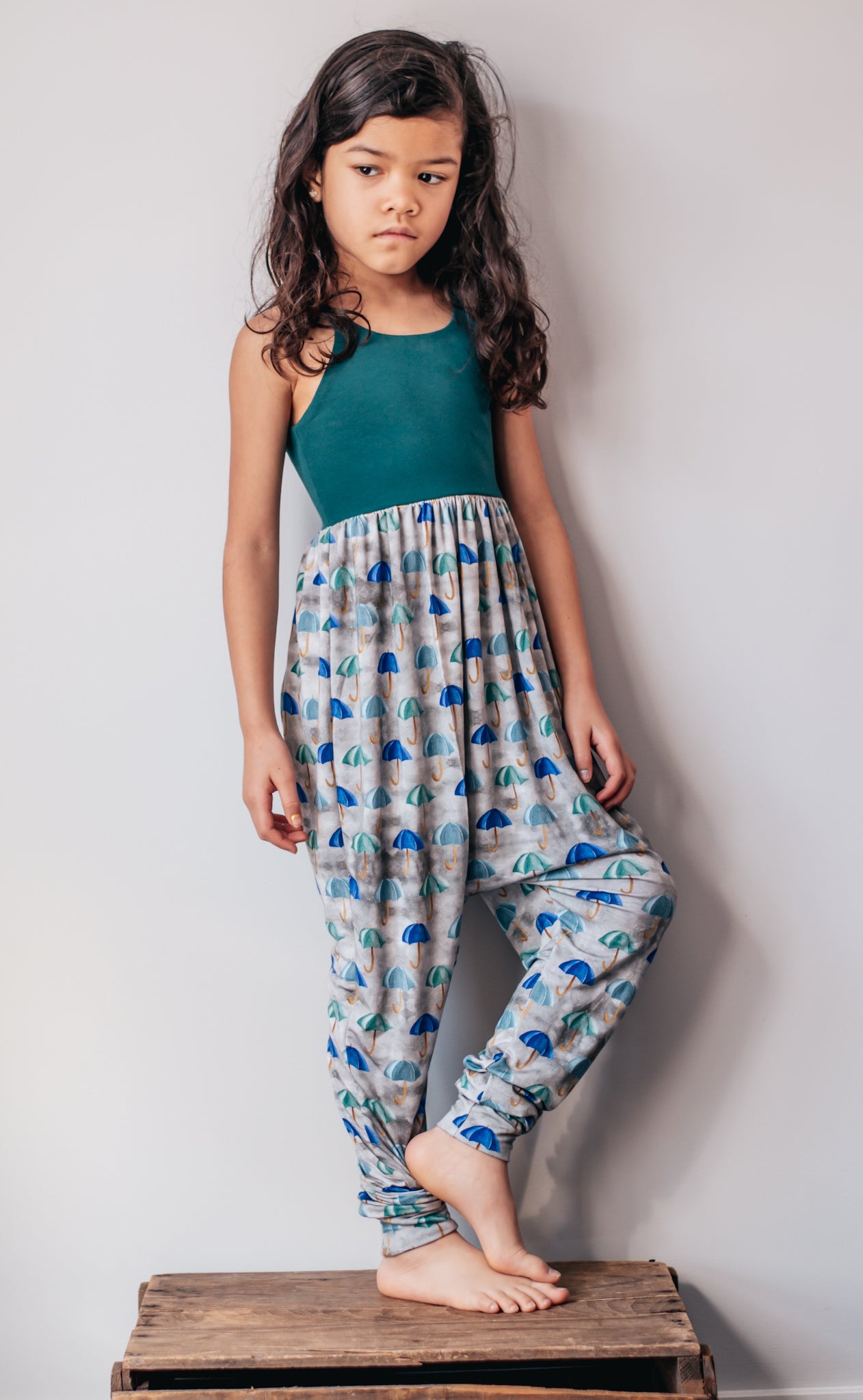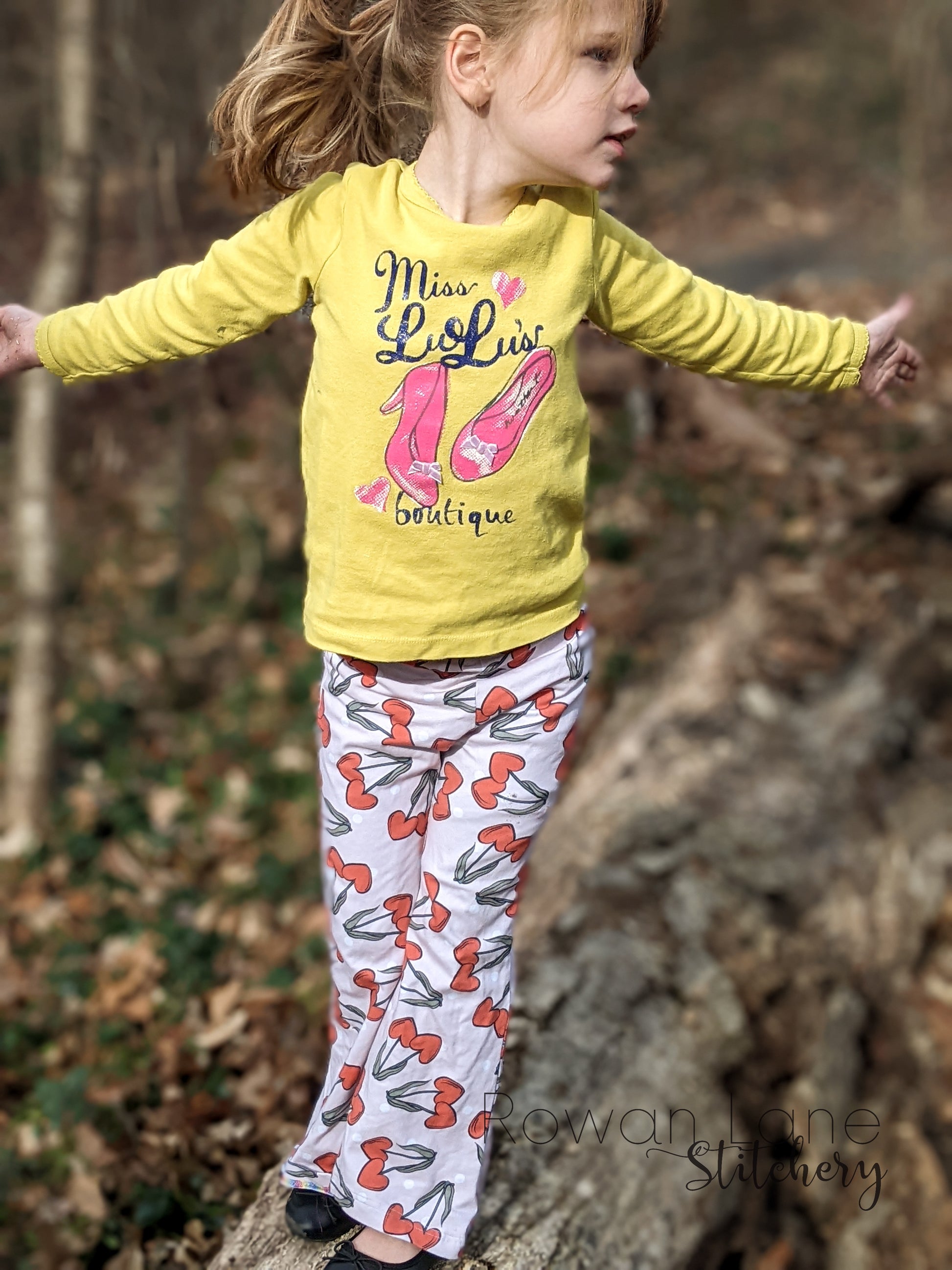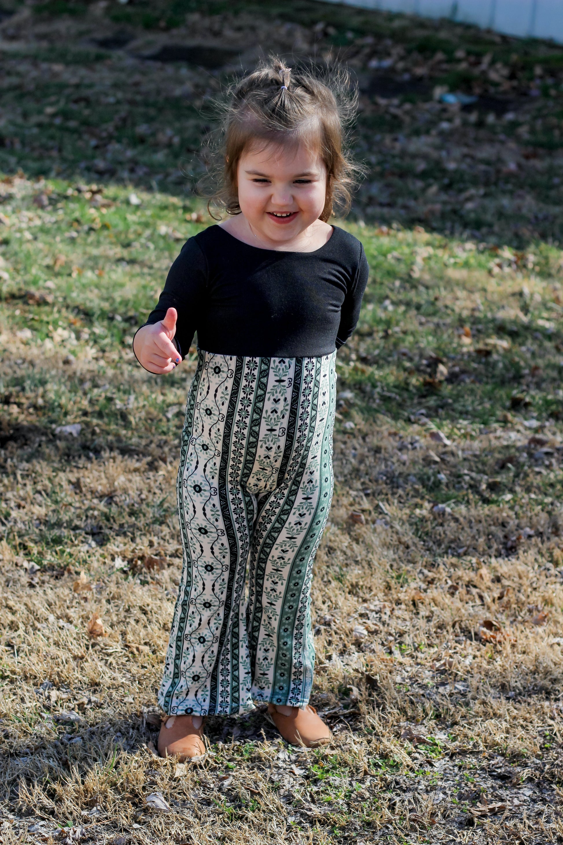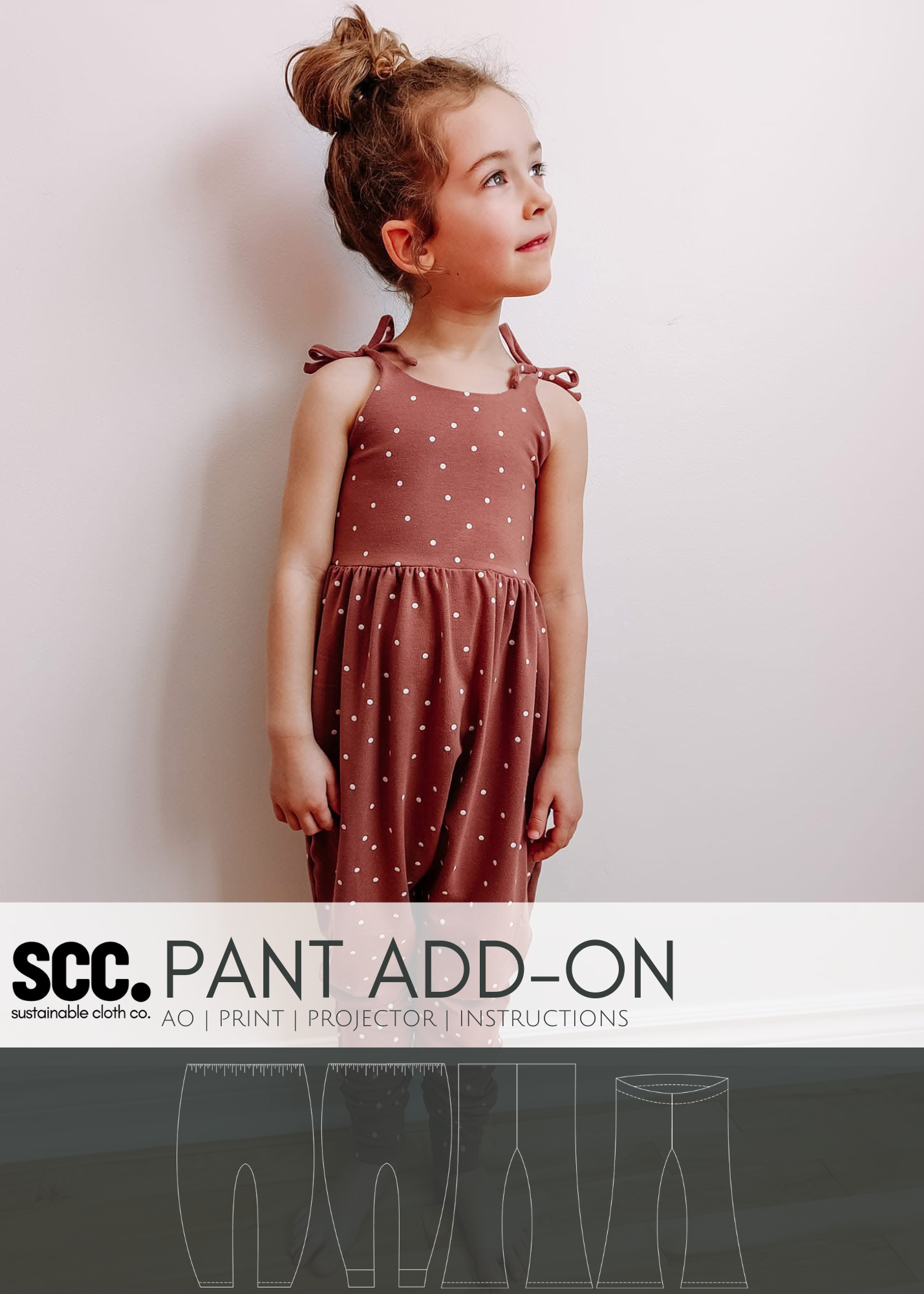 The pant add-on is a sewing pattern that includes options for creating a romper with a bodice pattern of your choice (this has been tested on the Baby-Youth Brielle sewing pattern for reference). With the pant add-on you can create a flare or drop crotch with a gathered waist romper or add elastic to the flares to create stand alone pants. This pattern has been tested in sizes newborn through youth XL (14/16) and is drafted for knit fabrics with 4 way stretch.