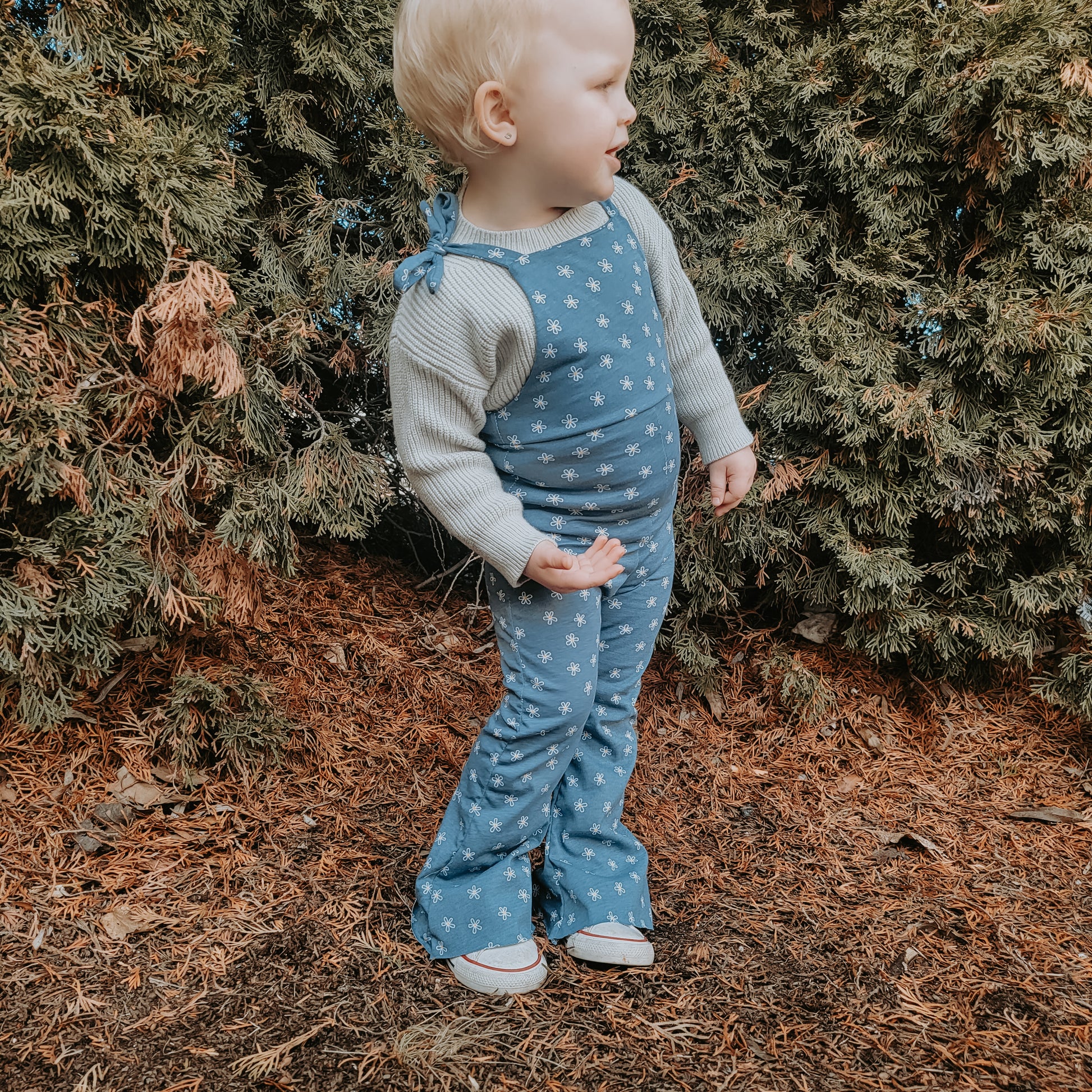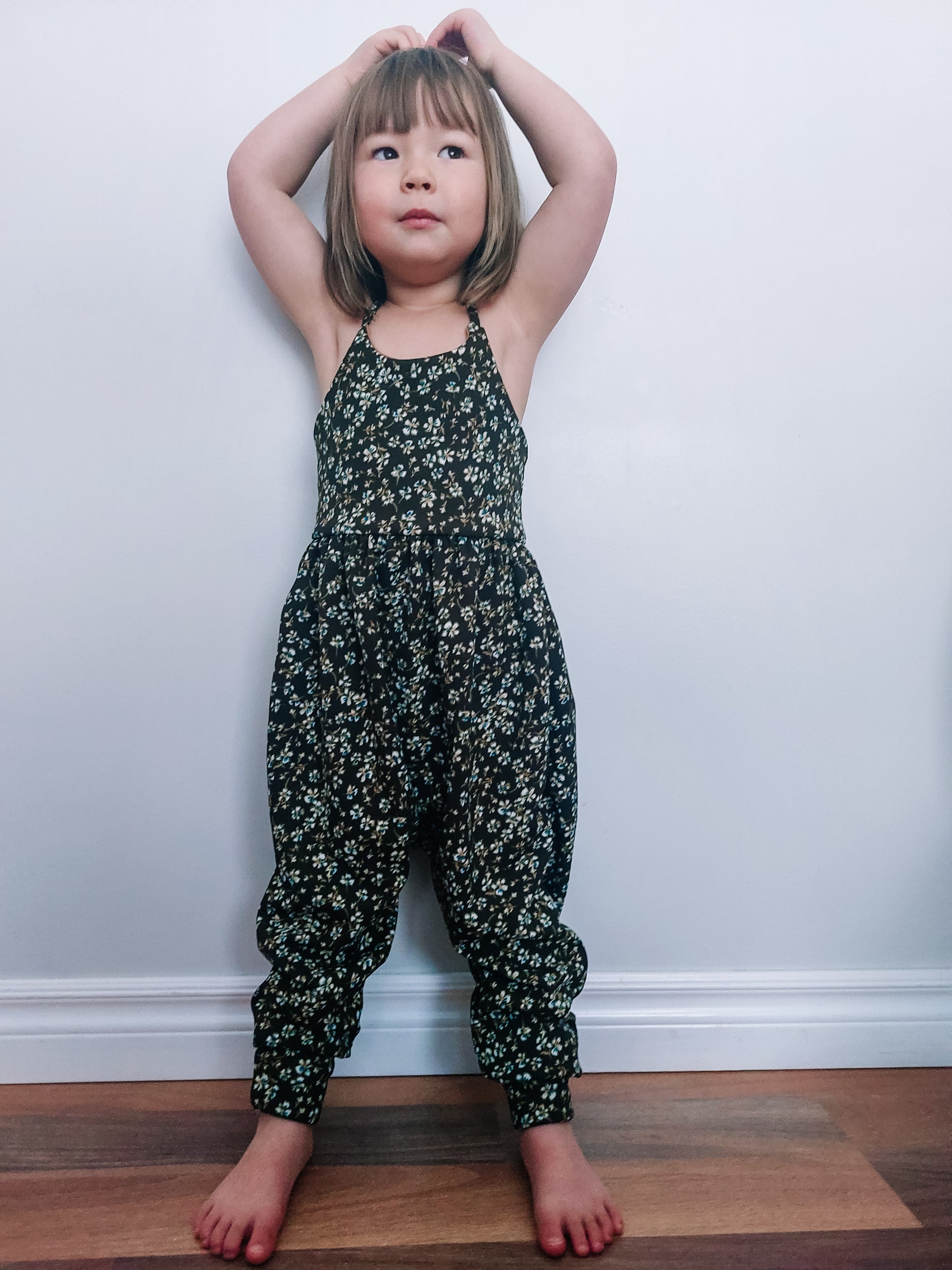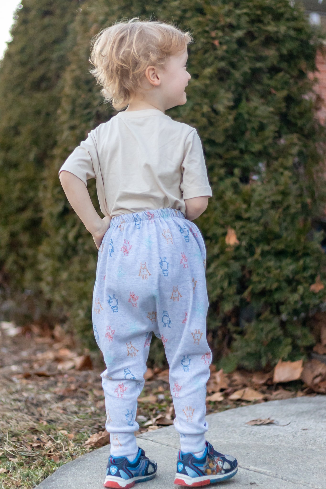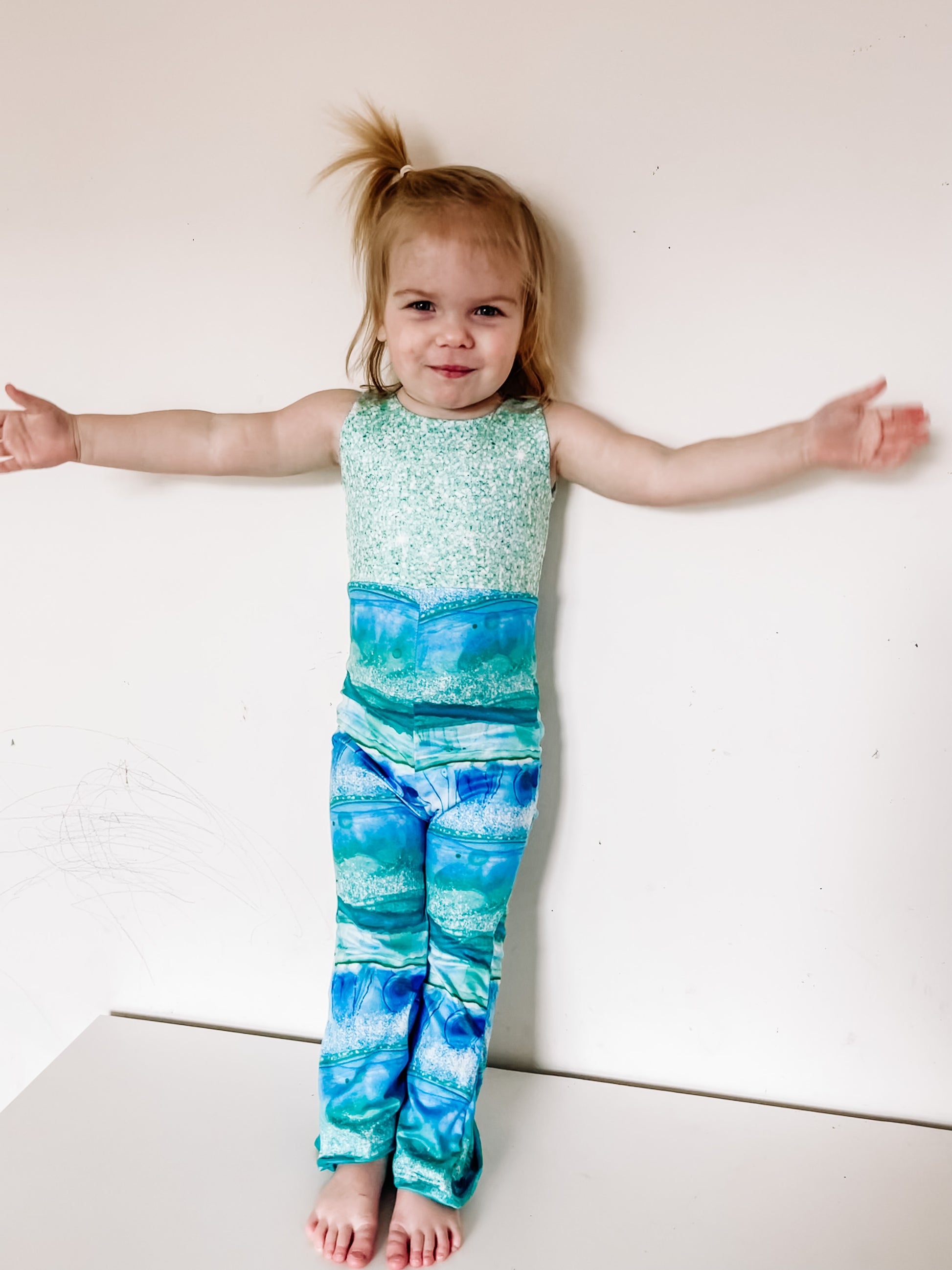 The pant add-on is a sewing pattern that includes options for creating a romper with a bodice pattern of your choice (this has been tested on the Baby-Youth Brielle sewing pattern for reference). With the pant add-on you can create a flare or drop crotch with a gathered waist romper or add elastic to the flares to create stand alone pants. This pattern has been tested in sizes newborn through youth XL (14/16) and is drafted for knit fabrics with 4 way stretch.
