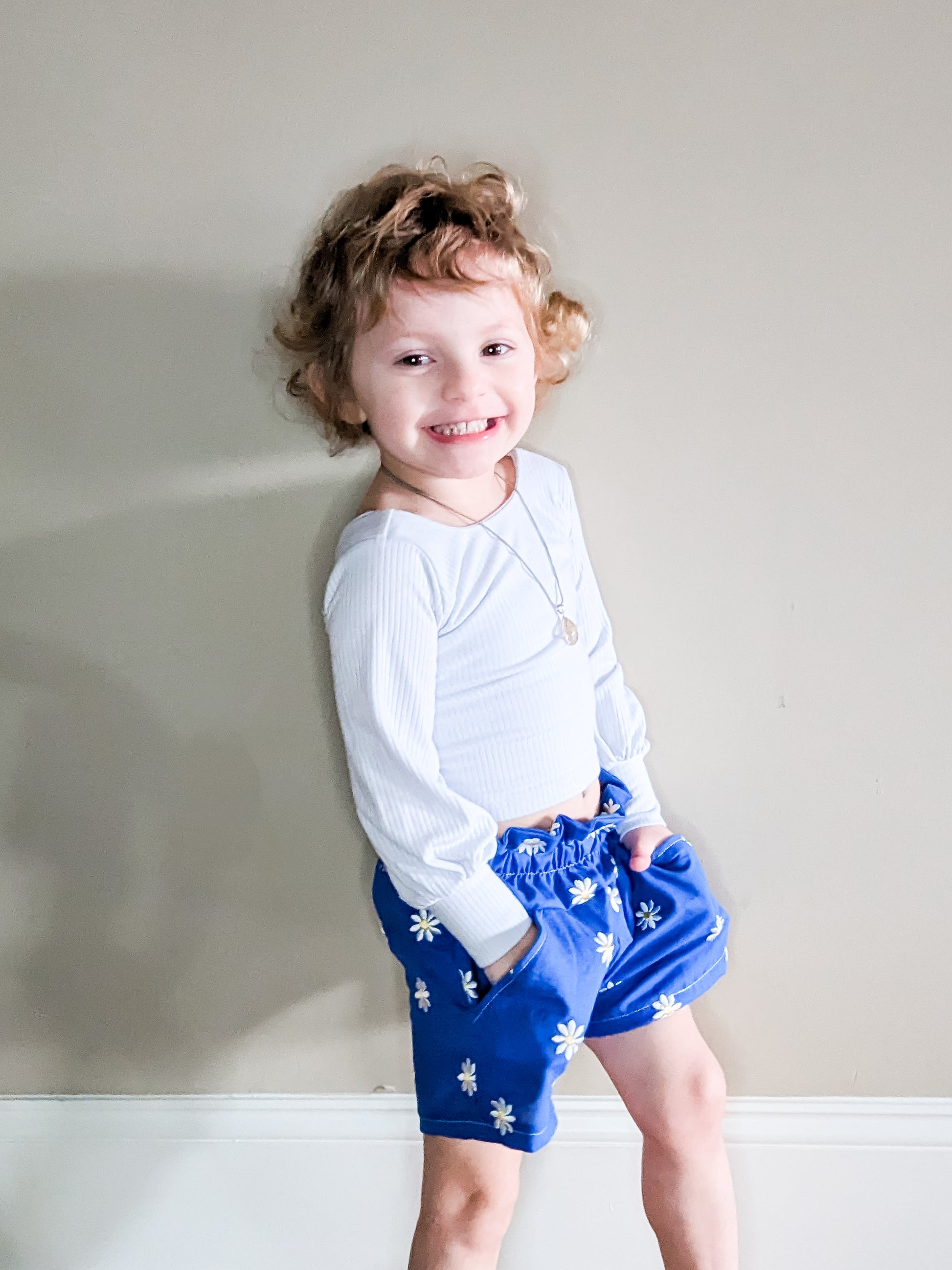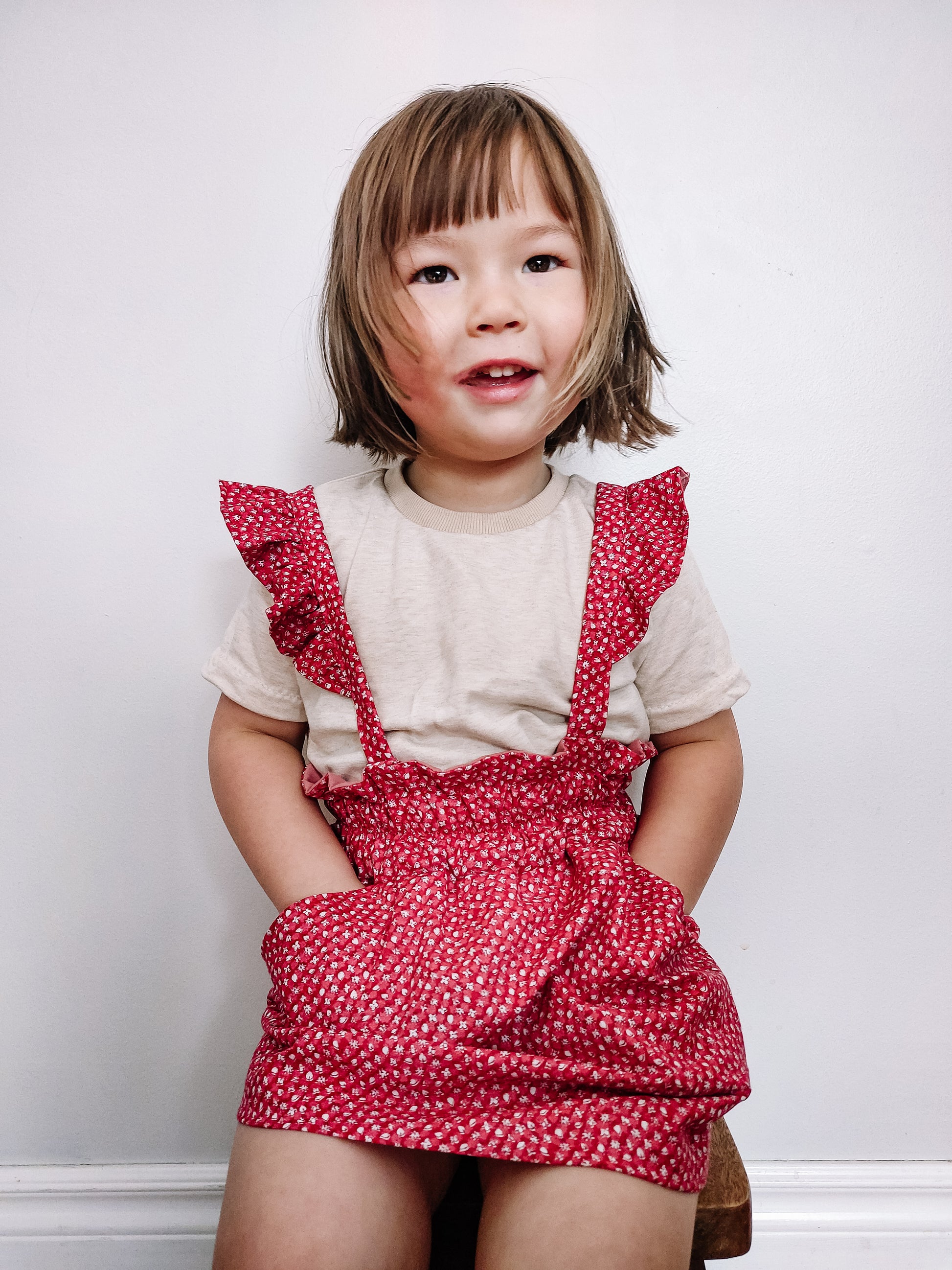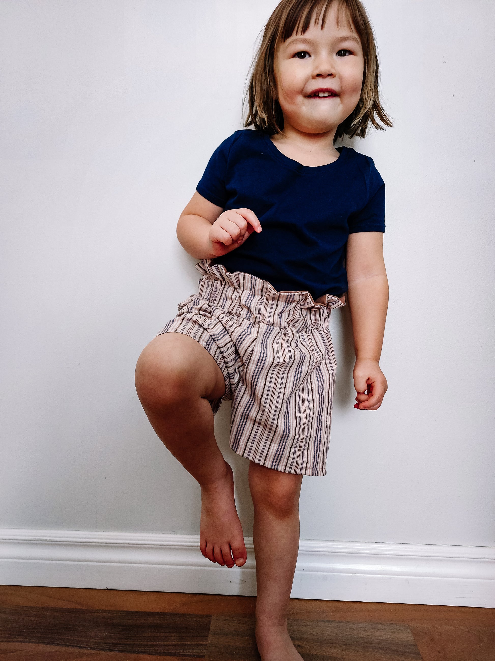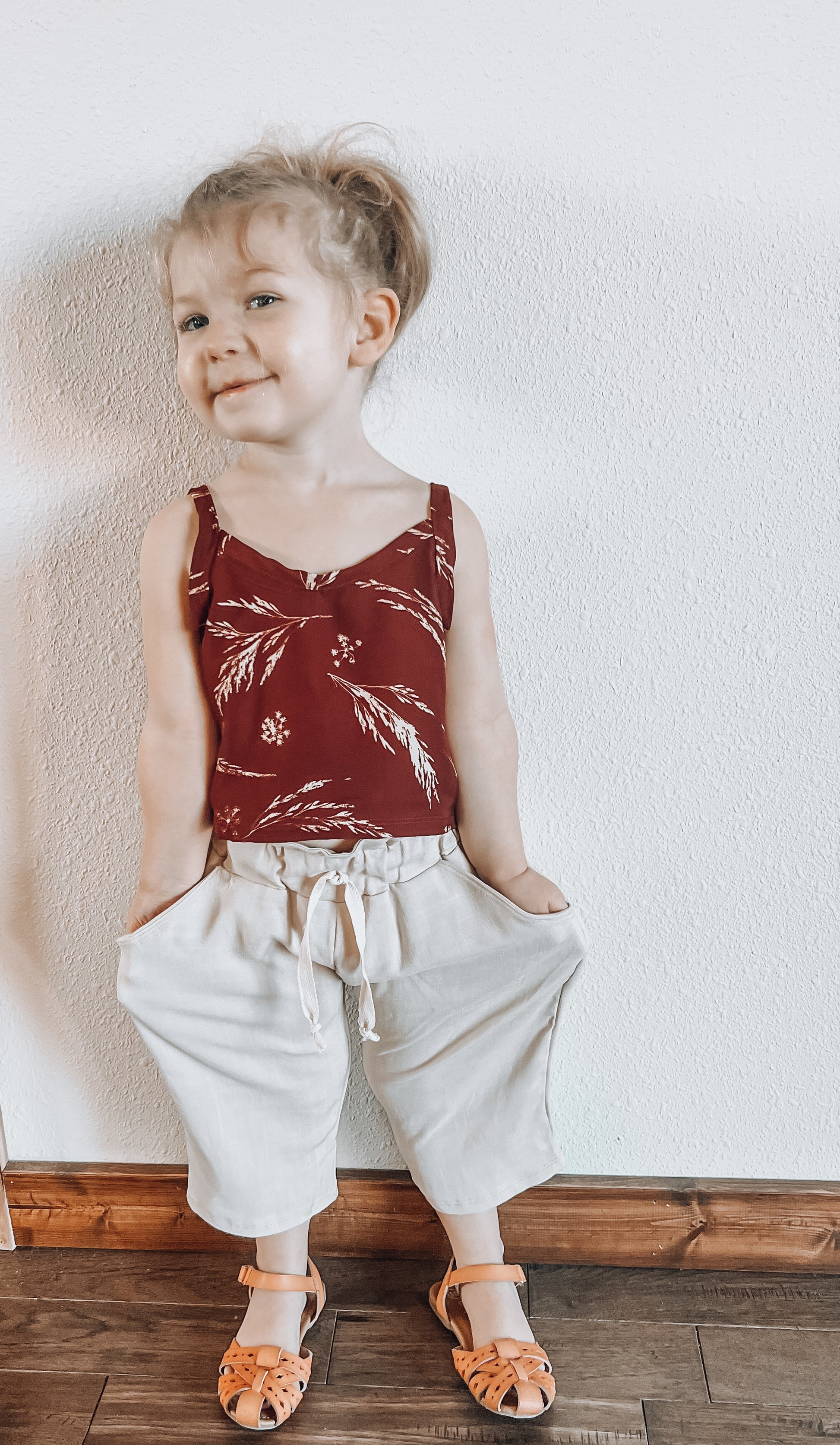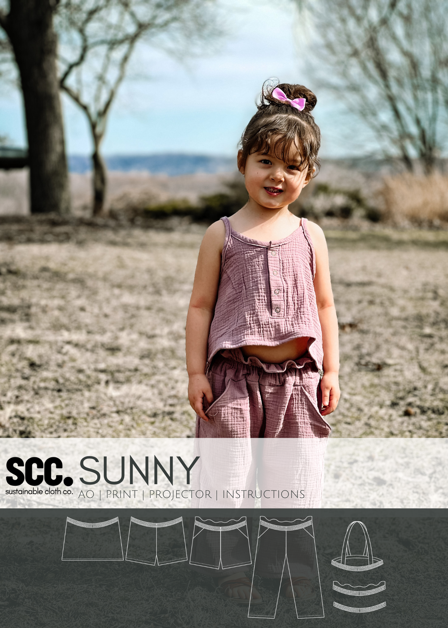 Sunny comes in many variations and options perfect for all seasons and genders. With two waistband options- basic or paper bag waist, two rise options- mid or high rise and the option of having suspenders. Sunny is a quick and satisfying woven sew for all levels of sewists. Sunny has been tested from newborn-youth xl(14/16).