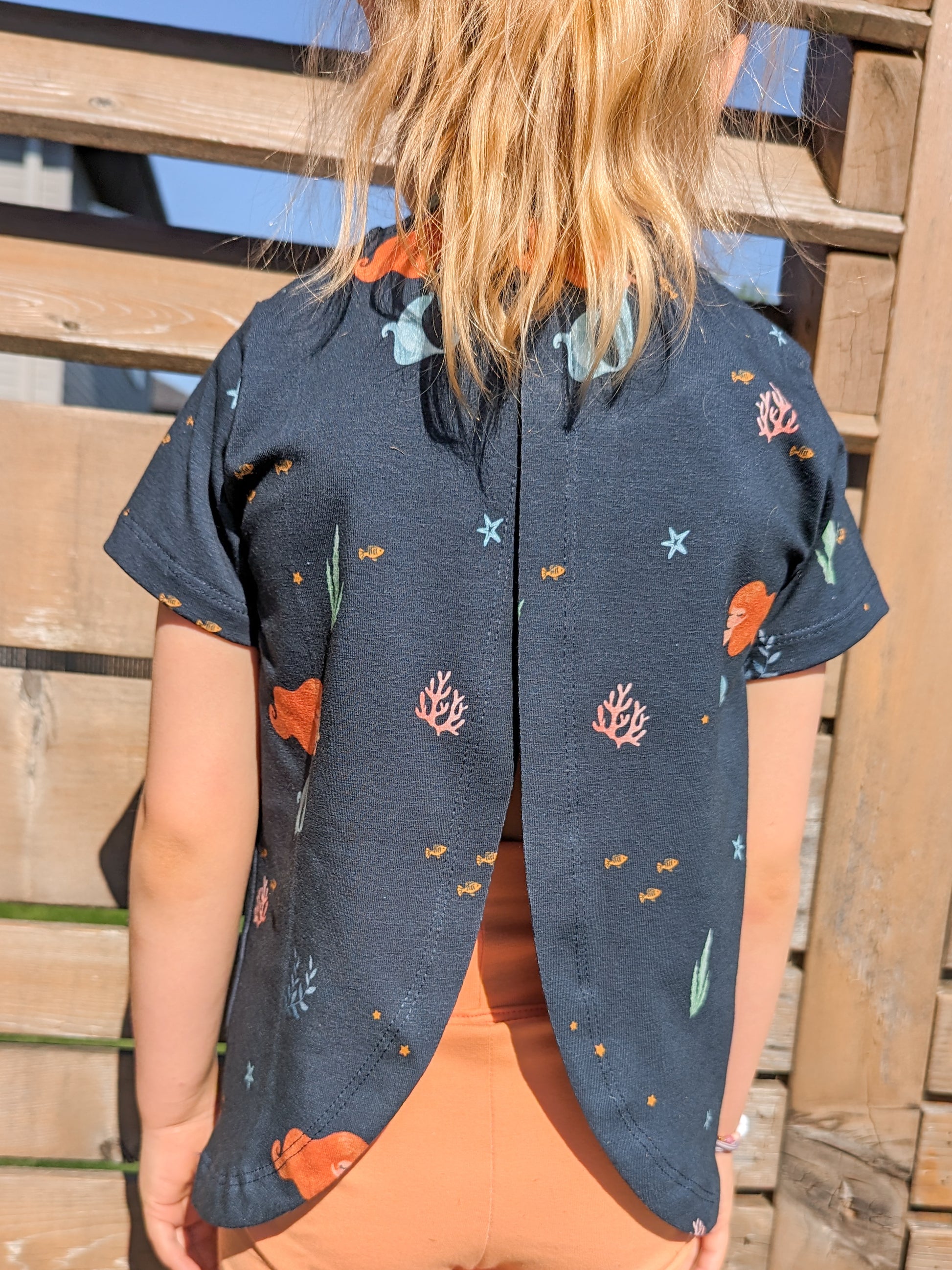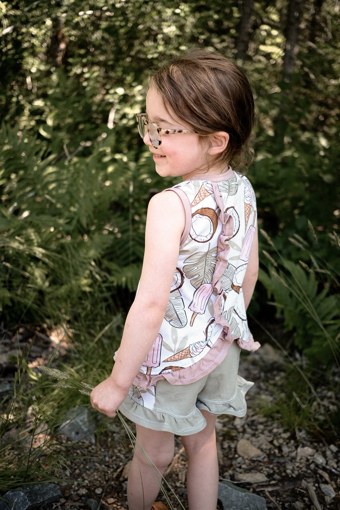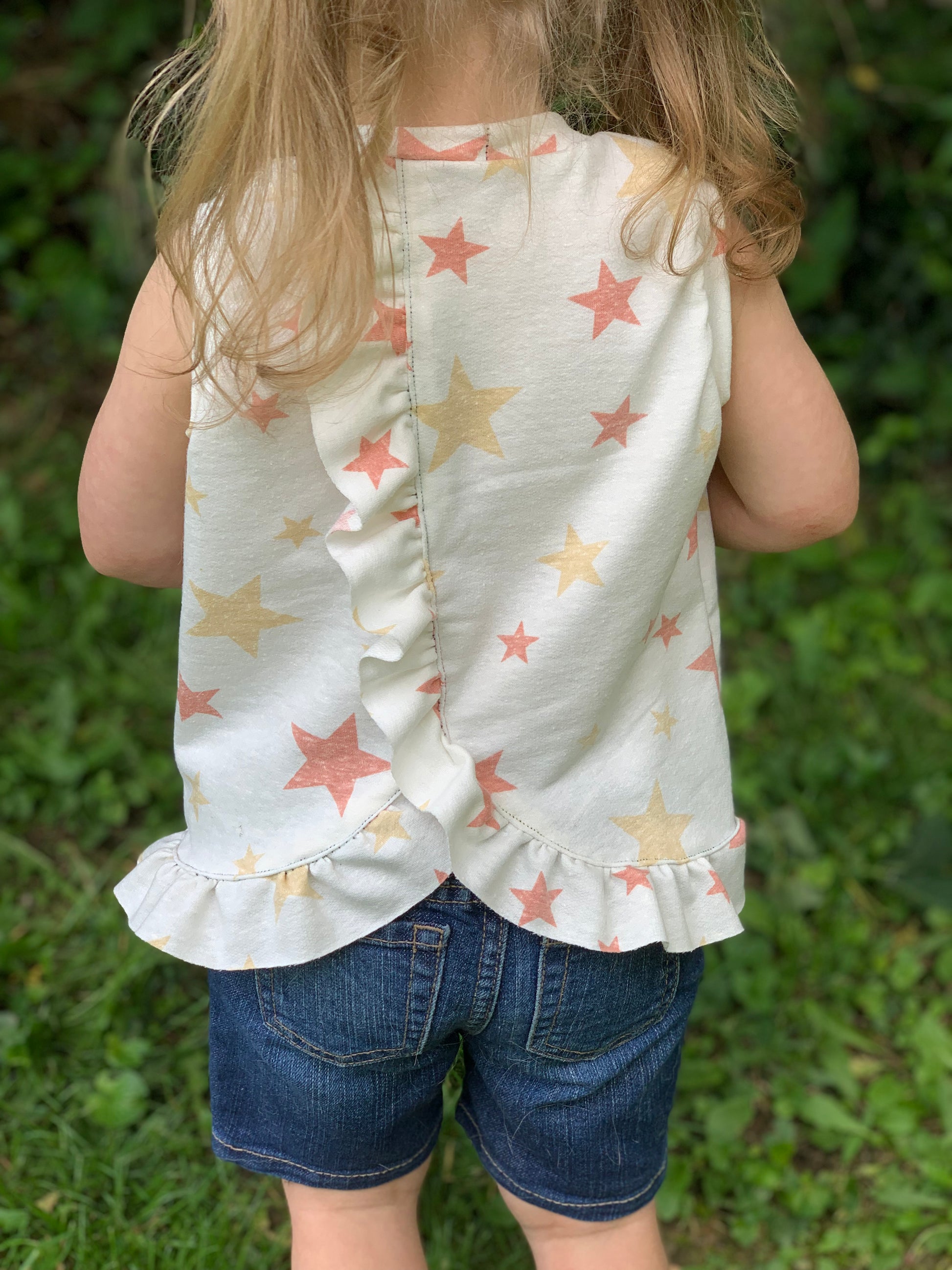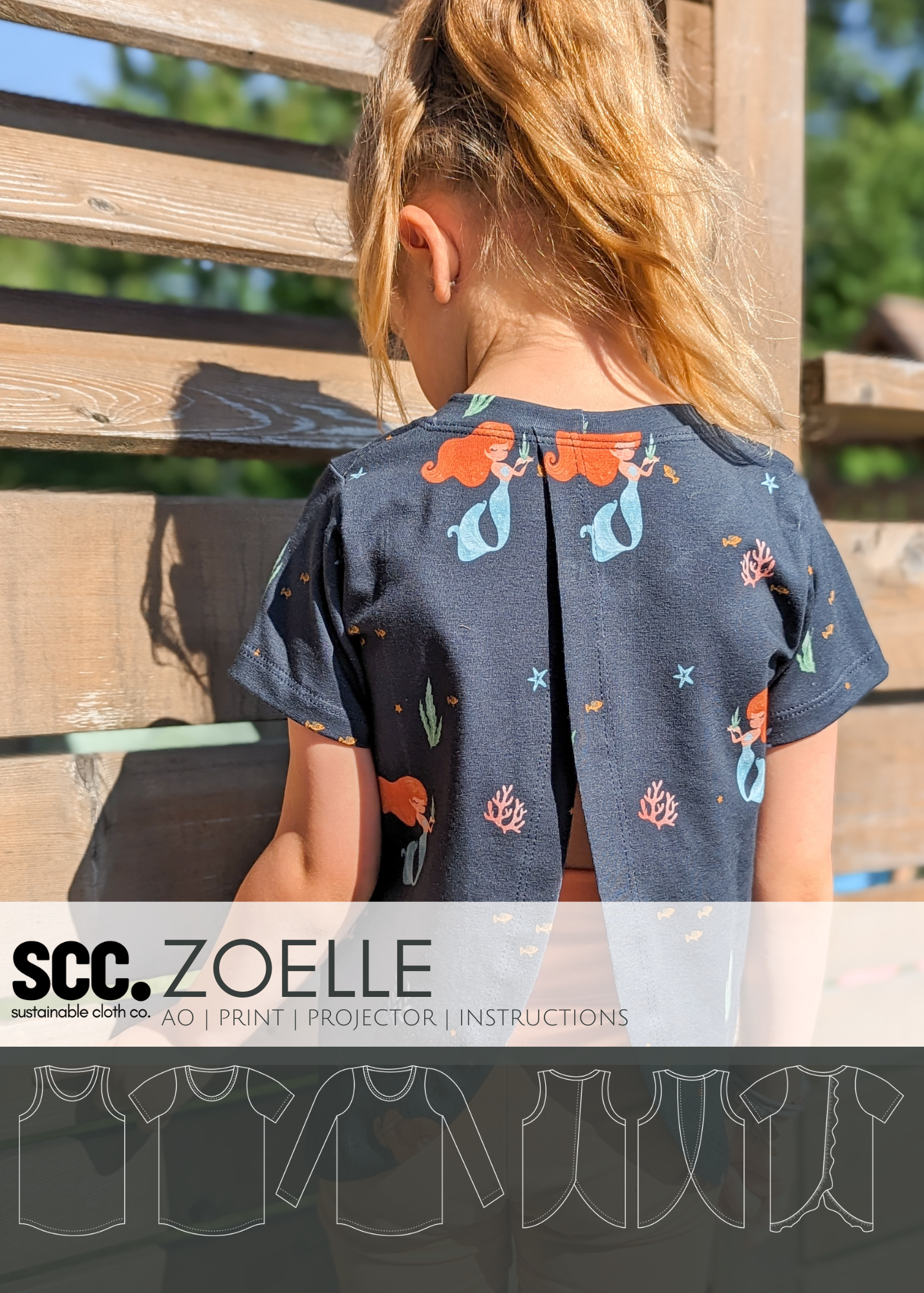 Zoelle is a loose fitting top with four back body finishes- open back, ruffle open back, seam back and ruffle seam back. Zoelle also offers tank, short and long sleeve options to make it all season friendly. Zoelle is a quick sew intended for knit fabrics.